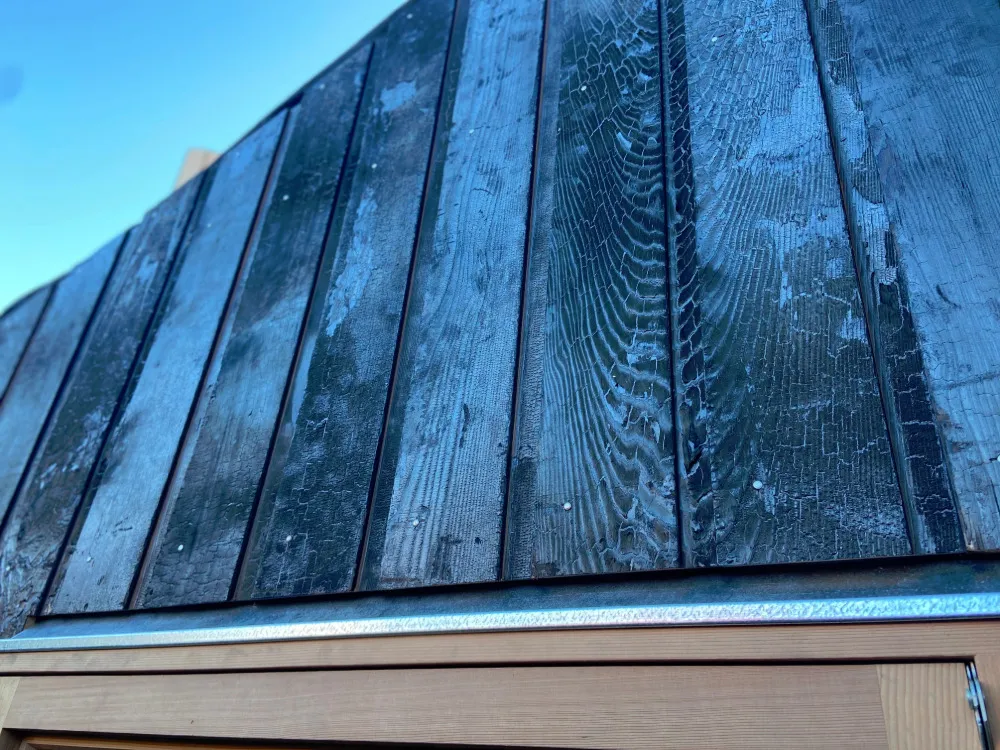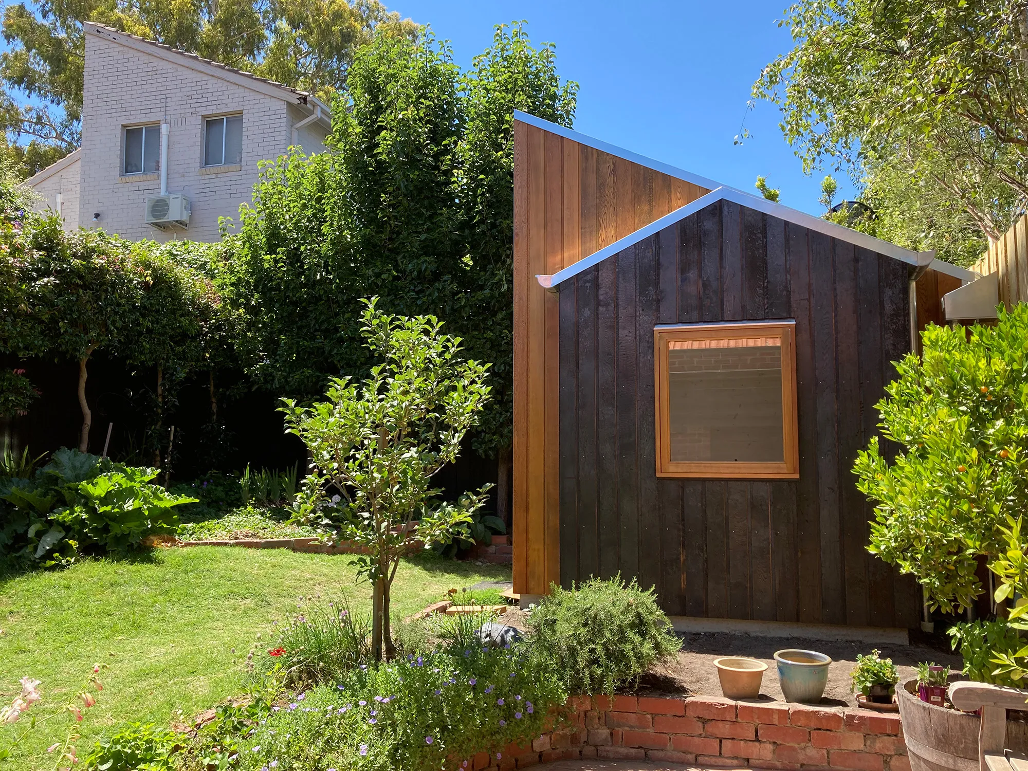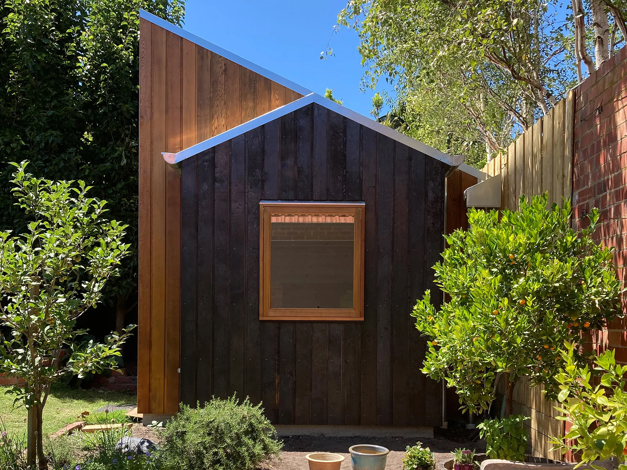Crafted from cedar and galvanised metal, the exterior has begun to patina, strengthening its connection to the garden.